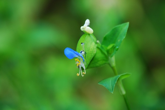 - 꽃은 6월부터 8월 사이, 이른 아침에 피며, 꽃잎은 여섯 장으로 위쪽 두 장은 파란색, 아래쪽 네 장은 투명하거나 흰색입니다.