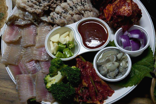 6. 돼지고기 수육과 홍어, 묵은지를 곁들여서 홍어삼합으로 먹는다.