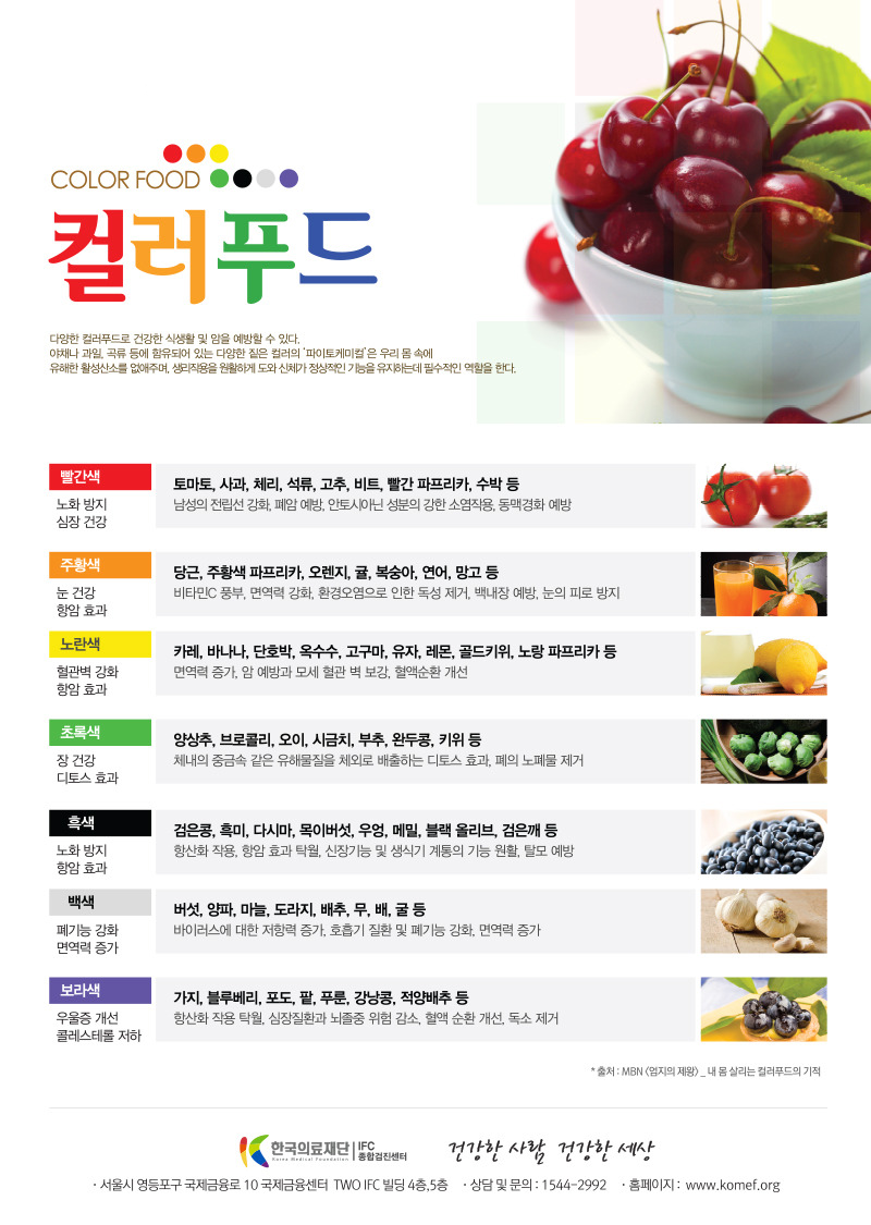 컬러푸드는 각각의 색을 내는 피토케미컬(phytonutrient)이 몸의 활성산소 제거, 면역력 증강, 암 예방, 혈관 및 피부 건강 등 다양한 건강 증진 효과를 갖고 있으므로, 여러 색깔의 과일과 채소를 골고루 섭취하는 것이 좋습니다.