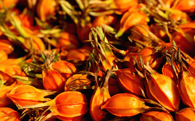 - 열매는 긴 타원형 또는 장타원형으로, 익으면 노란색에서 주황·붉은빛을 띠며 매우 진한 노란 색소를 낸다.